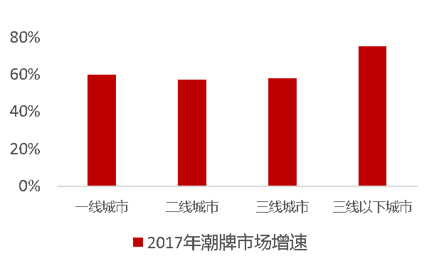 (2)從潮牌服裝市場消費(fèi)城市規(guī)模來看,消費(fèi)一二線城市引領(lǐng)消費(fèi),三線以下城市增速強(qiáng)勁。一二線城市消費(fèi)基礎(chǔ)好,潮牌消費(fèi)額處于全國領(lǐng)先的高度,增速相對(duì)穩(wěn)定。而對(duì)于三線及以下城市雖然消費(fèi)額較低,但增幅卻高于一線城市。
