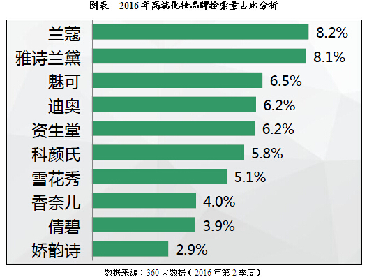 2016年,高端品牌,品牌數(shù)量少集中度高,Top10品牌檢索量占比近60.0%,其中雅詩(shī)蘭黛和蘭蔻排名前兩位,檢索量占比均在8.0%左右。