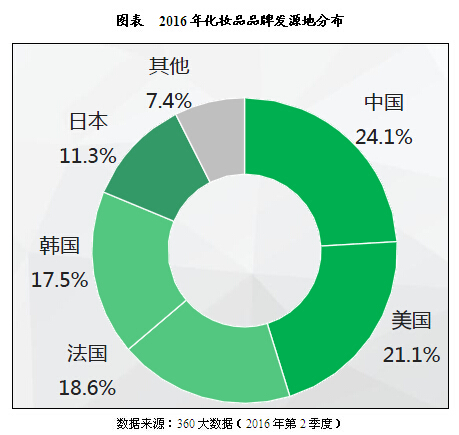 化妝品品牌發(fā)源地集中度高,中美法和日韓五個(gè)國(guó)家的品牌檢索量占比超90.0%