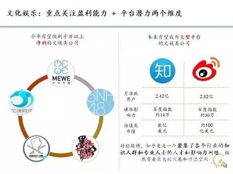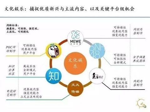 中間棕色的是最重要的,就是平臺的形成,我們認為平臺的形成還有幾年。當有平臺時,人工智能就可以普及,應用就可以井噴了,這個還要4到5年。這4到5年非常關鍵,因為在人工智能平臺未形成之前的這段時間,人工智能專家還會有非常獨特的優勢,如果我們找到這些專家就有創業的機會。任何一個好的技術變成一個平臺都需要若干年時間的演化,移動互聯網如此,人工智能如此。我們在人工智能方面投了很多公司,我們獨特的優勢是我們在中國、美國都有投資。美國的投資非常著重AI的領域,同時中國畢業的學生對AI興趣非常大,國內外有很多頂尖媒體都報道了我們所投資的公司,例如《紐約時代》、《福布斯》雜志等都已經報道了我們的項目。2.文化娛樂我們第二大投資領域應該是文化娛樂領域。文娛我們看兩個方向。第一是IP,而且是可持續性的,呈高成長性的那種IP。第二要看用戶的平臺,當然平臺是可遇不可求的,不是在創業第一天就做出一個平臺,這是兩個我們主要看到的方向。