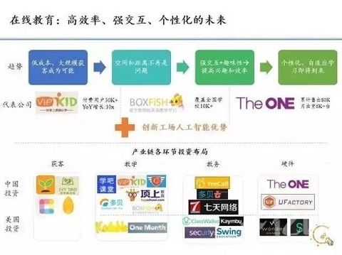 那么在內容方面我們一個專長,過去跟大家介紹的,就是了解95后,我們有一批經理,每天去找新的現象和投資機會,比如當年投美圖秀秀、SNH48,比如說我們投了動漫,是日本最頂尖的,還有我們投了古風,年輕人很喜歡這個,這些可能不見得在座的人都了解,因為95后這一批人是真正出生在成長在虛擬世界里面的,他們的思維方式跟我們都不一樣。我很幸運的是,雖然當我的90后孩子在用他們喜歡的產品時,我沒有辦法再追上他們的腳步,但是由于我的孩子允許我在Facebook上成為他的朋友,所以我還是有機會了解這些新東西的趨勢。終有一天,我們會發現我們老了,孩子們玩的東西玩不慣了,最后就OUT,我相信在國內看到直播、網紅,他們還會越走越快,終有一天他們也會OUT,我的悲傷你們有一天也會感同身受。3.在線教育下一個領域是在線教育。
