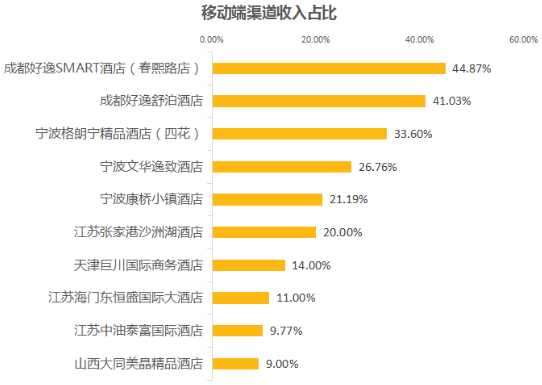 從數據上來看,上榜酒店的移動端渠道收入占比依舊主要集中在10%—40%之間。很多酒店不愿在酒店移動互聯(lián)網直銷化精力而寧愿與OTA渠道合作,主要原因是不知道互聯(lián)網直銷為酒店能帶來怎樣的收益。從這些榜單數據可以清晰的看到,只要酒店用心去做,移動互聯(lián)網直銷渠道將為酒店帶來更多利潤。