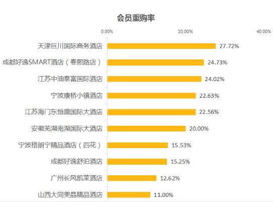 從榜單上來看,6月份的TOP10會員重購率環(huán)比5月份相差不大,呈穩(wěn)定狀態(tài)。其中,天津巨川國際商務酒店以27.72%的會員重購率霸占了榜單首位,可喜可賀。另外,與往月類似,6月份的TOP10中大部分酒店的會員重購率依舊保持在20%—30%之間,沒有出現(xiàn)明顯的斷層現(xiàn)象。