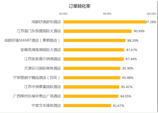 在數據中我們可以看到,榜單中的前十名酒店訂單轉化率都維持在80%以上,尤其是第一名的好逸舒泊酒店,轉化率高達97.28%,相信與其優(yōu)質的服務和良好的用戶體驗是分不開的。