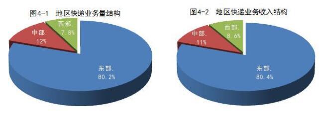 與去年同期相比,東部地區快遞業務量比重上升了0.6個百分點,快遞業務收入比重上升了0.4個百分點;
