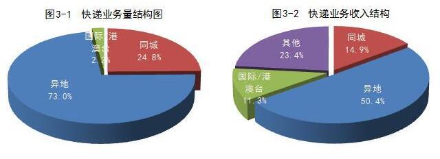 1-2月,同城、異地、國際/港澳臺快遞業務量分別占全部快遞業務量的24.8%、73%和2.2%;業務收入分別占全部快遞收入的14.9%、50.4%和11.3%。