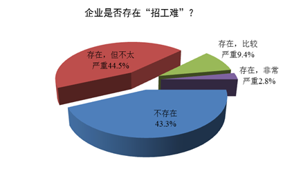 調查顯示,一季度的353家企業中有200家企業認為目前存在“招工難”問題,占比達56.7%,環比上升4.3個百分點,其中認為目前存在“招工難”問題但不太嚴重的有157家,占44.5 %,認為比較嚴重的有33家,占9.4%,非常嚴重的有10家,占2.8 %。
