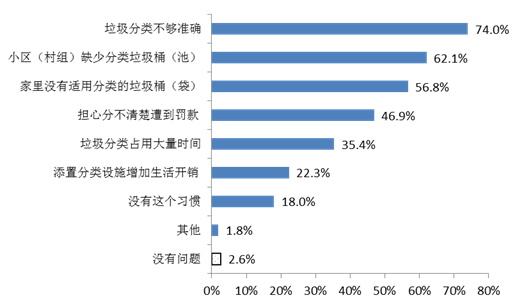 如果要進(jìn)行生活垃圾分類,受訪居民表示個(gè)人或家庭主要擔(dān)心的問(wèn)題是“垃圾分類不夠準(zhǔn)確”,選擇比例占74.0%;其次擔(dān)心“小區(qū)(村組)缺少分類垃圾桶(池)”,占62.1%;第三是“家里沒(méi)有適用分類的垃圾桶(袋)”,占56.8%。此外,選擇“擔(dān)心分不清楚遭到罰款”“垃圾分類占用大量時(shí)間”的比例也較高,都在35%以上(此題為多選,相加不等于100%,詳見(jiàn)圖2)。